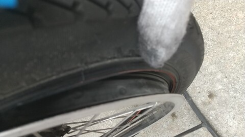 作業開始。後輪の空気を一回抜く。抜いてしまえば、タイヤを左右どちらかに寄せることでホイールの裏側にアクセスできる。